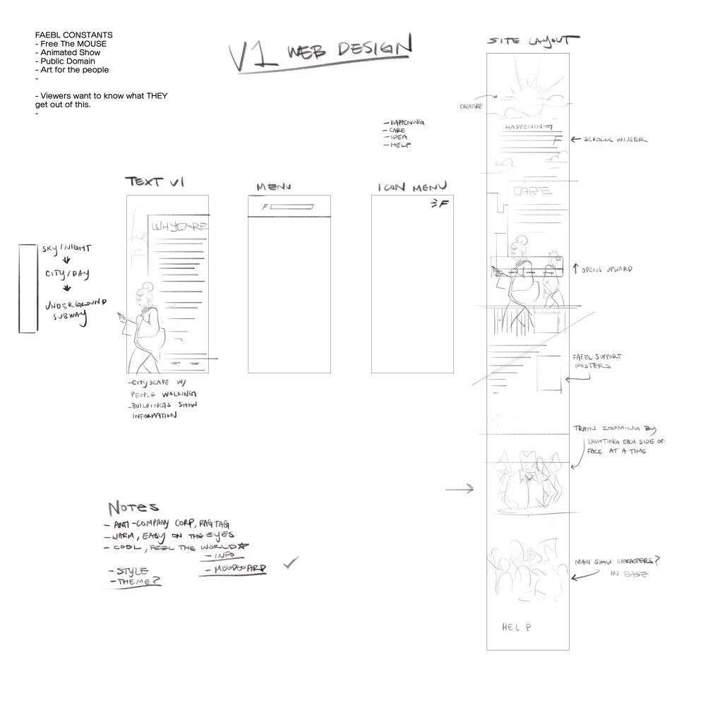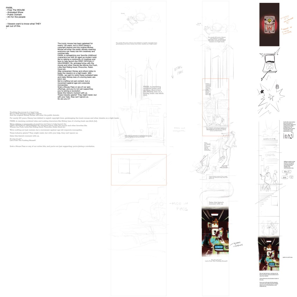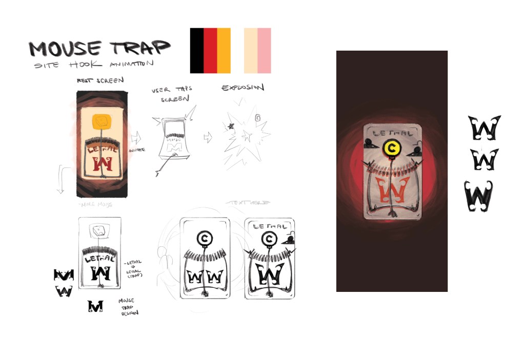 A raw collection of images displaying the process of the website development. Starting with general ideas, then the hook of the website (The Mousetrap Animation), to the mobile/desktop layout, then the color palette, etc.